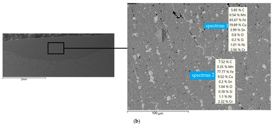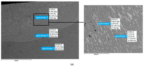 Figure 4 shows the structure of the alloyed layer made from a mixture of CuSn10 + 20% CrxCy with a paste thickness of 0.25 mm. It is noted that the main structure is equiaxed and columnar crystalline grains. The microhardness values for the central, marginal, and marginal zones differ slightly and are in the range of 500–700 HV. Figure 5 shows photographs taken on an electron microscope with the determination of chemical elements in the surface layer. Figure 5a shows the CuSn10 system. Figure 5b shows the CuSn10 + 20% CrxCy system. The main element in the matrix distribution is iron. The chromium content in the bronze-rich zone is significantly lower than in the iron-rich zone in Figure 5. The tendency to form complex carbides can cause a decrease in the solubility of chromium in the bronze matrix.