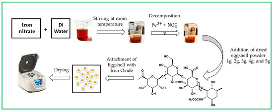 Next, 1, 2, 3, 4, and 5 g of eggshell powder were added per 100 mL mixture of iron nitrate. During the synthesis, eggshells were attached to iron. The above mixture was stirred at room temperature until its color changed from yellow to rust orange. The pH was measured as neutral. Then, the mixture was dried at 60 °C, washed with DI water, and centrifuged three times to remove by-products [22]. Figure 1 shows a schematic representation of iron oxide NPs.