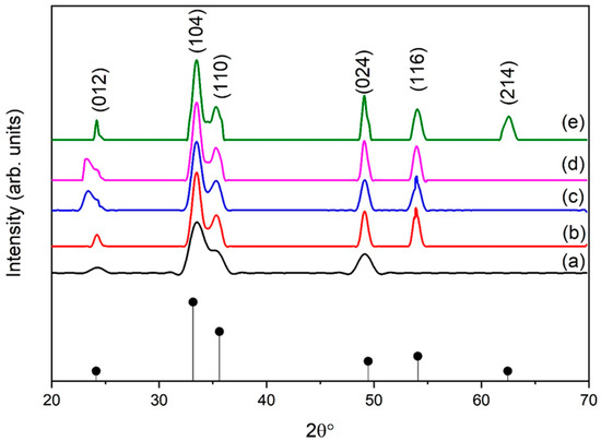 XRD pattern of α-Fe2O3 for different eggshell contents: (a) 1 g, (b) 2 g, (c) 3 g, (d) 4 g, and (e) 5 g.