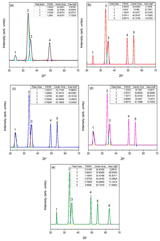 Corresponding XRD-fitted diagram of eggshell-mediated hematite: (a) 1 g, (b) 2 g, (c) 3 g, (d) 4 g, and (e) 5 g.