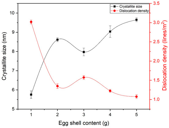 The crystallite size of eggshell-mediated iron oxide is shown in Figure 4. The crystallite size increased up to 2 g of eggshells, while a slight decrease in crystallite size was observed at 3 g. Further increases in eggshell content led to larger crystallite sizes. As observed in Figure 2, a higher shell content led to phase strengthening and stabilization. After reaching phase stability, the emergence of nuclei occurred, resulting in larger crystallites. From the crystallite size, the dislocation density (lines/m2) was also calculated by Equation (5). Almost-decreasing behavior was observed for dislocation density, which is a prerequisite for bone applications. Notably, electrostatic attraction to charged groups, substitution of metal ion ligands by appropriate nucleophilic groups of the protein, or a hydrophobic kind of contact are all possible ways for Fe3+ to bind to the protein [32]. This binding leads to an increase in crystallinity and phase strengthening.