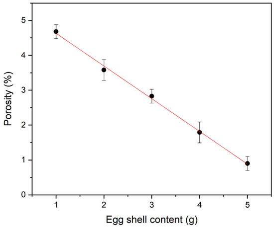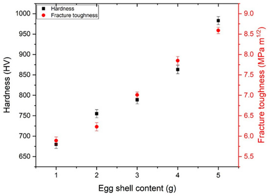 Table 1 and Figure 9 show the variation in fracture toughness with the eggshell content. The main parameters affecting the values of hardness and fracture toughness were phase purity, grain size, porosity, density, crack-free structures, and agglomeration. Following Equation (10) further confirms the relation between porosity and hardness.
