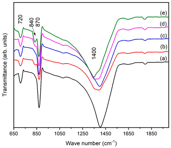 FTIR spectra of iron oxide are presented in Figure 8 for various eggshell contents. Figure 8 reveals that the samples mostly contained carboxyl, phenolic, and hydroxyl groups. The peak at 720 cm−1 belongs to Fe-O stretching. A broad band at 868 cm−1 confirms the presence of phenol groups, and the appearance of a new peak at 840 cm−1 demonstrates that Fe cations interact with C-O [35]. As the eggshell content increased, the phenol group width of this band increased, and sharpness of the band was observed. Eggshells were added aiming for applications in bone implantation. The formation of metal carboxylate due to the presence of minerals on the surface of iron oxide facilitates the formation of new bone. This type of investigation was is also reported by Yang et al. [36]. The strongest one was observed at ~1400 cm−1. Based on the literature [37,38], the band observed at ~1400 cm−1 was assigned to calcium carbonate coming from the eggshells. The intensities of the FT-IR peaks in the region of 1350 cm−1–1650 cm−1 decreased, which may possibly point towards alterations in the calcium carbonate contents. From these results, we can conclude that the eggshells were bound to the surface of the hematite. This reaction may occur during drying to form phenol groups and surface hydroxyl groups. The drying process may promote localized heating production due to the presence of organic additives. A comparison between Figure 8a and 8e indicates that peaks for phenol groups and calcium carbonate were present in all spectra. Therefore, it was concluded that hematite NPs are also modified by eggshells [36,39].