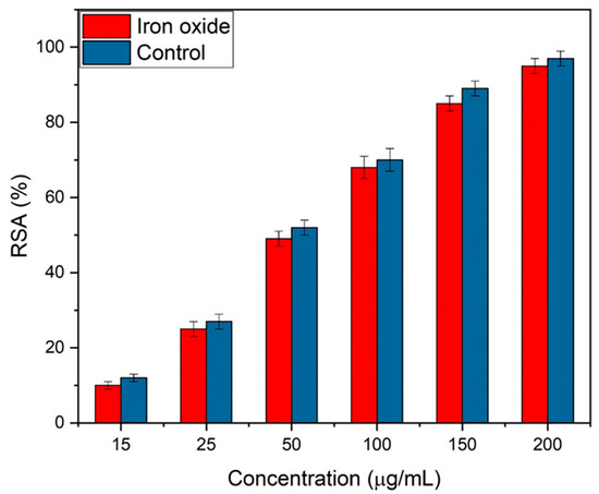 Iron oxide NPs are being synthesized for bone implantations; therefore, the study of their antioxidants is very important. The activity was carried out at different concentrations of 15, 25, 50, 100, 150, and 200 µg/mL of iron oxide. The free scavenging radical activity (RSA) improved with the concentration of iron oxide NPs, as shown in Figure 11. Eggshell-mediated hematite NPs showed 95% of RSA, which was higher, as reported earlier [48]. Ascorbic acid was used as the control and exhibited 96% antioxidant activity.