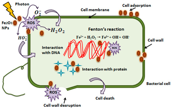 α-Fe2O3 acts as a double-edged sword, and is capable of damaging proteins, DNA, and lipids via the Fenton reaction [67]. This reaction takes place between Fe2+ ions and hydrogen peroxide (H2O2), which results in the formation of Fe3+ ions and hydroxyl radicals. Further, Fe3+ ions and superoxide radicals (O2−) react to form oxygen molecules (O2) and regenerate Fe2+ ions (initial catalyst). Moreover, another main antibacterial mechanism of hematite NPs is the generation of ROS (reactive oxygen species), which have the ability to damage DNA molecules [68], such as through photocatalysis and Fenton reactions [69]. Metal ions have the potential to bind with carboxyl (–COOH), amino (–NH), and groups of proteins to inactivate or inhibit their functions partially or completely [70]. Moreover, α-Fe2O3 NPs can damage the cell walls of bacteria by direct contact with the cell wall [71]. Also, they can pierce into the cytoplasm, resulting in vacuole formation and cell wall destruction [72].