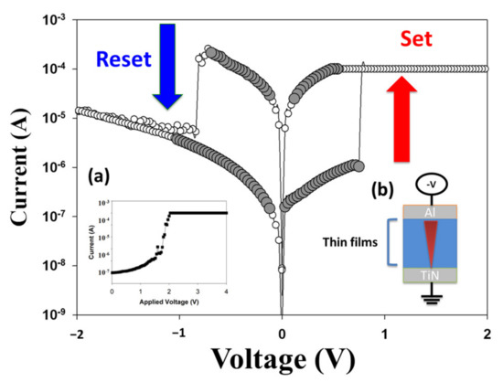 For modern computer science and technology, there are mainly two kinds of volatile and non-volatile characteristics, read and write methods, of many memory devices. The main difference in volatile memory devices is that they need electrical power to maintain their performance ability and operation efficiency, and non-volatile memory devices do not support the application of electrical power. Recently, with the miniaturization technology of modern non-volatile flash memory devices, many novel memory devices were widely developed, such as resistance random accesses memory (RRAM) [1,2,3,4,5,6], magnetoresistive random-access memory, ferroelectric RAM, and phase-change memory devices. In this study, we used thin film RRAM devices because of their simple structure, low power loss, and high device density [7,8,9].