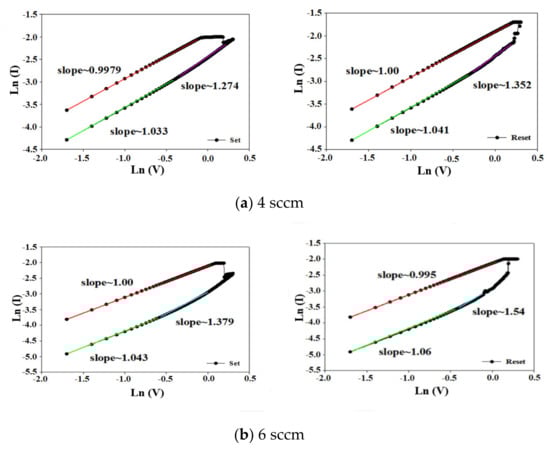Figure 6 shows the ln(I)–ln(V) plots of ITO/GdOx:SiO2/TiN/Si RRAM devices for different oxygen gas flows. In Figure 6a, for 4 sccm oxygen gas flow, the slope of the RRAM devices for LRS/HRS states in set/reset regions can be seen and it was calculated to be about 1. The ohmic conduction transport mechanism was found from the I−V curves of the RRAM devices for low voltage and thinner film thickness were discussed. Additionally, the I−V curves of the RRAM devices for different oxygen gas flows all exhibited the ohmic conduction transport mechanism when low voltage was applied, as shown in Figure 6b–e. As shown in Figure 2, the I−V curve properties of the GdOx:SiO2 thin film RRAM devices with low applied voltage for set and reset states shows the ohmic conduction transport mechanism.