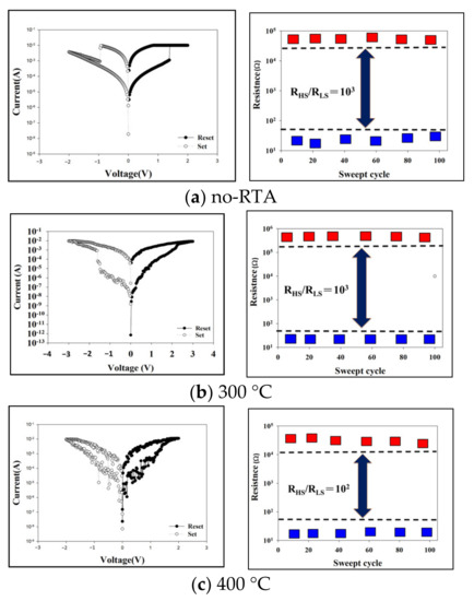 Compared to the as-deposited and RTA samples in Figure 7a, the I−V switching curve properties were better and stable. When the RTA temperature increased to 400 °C, the defects became worse and the electron conduction transport behavior became difficult, and the high voltage and worse I−V switching properties of the GdOx:SiO2 thin film RRAM devices were increased and found.