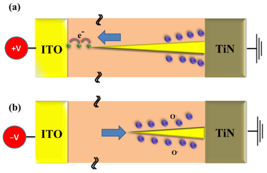 Figure 10 describes the electrical metallic filament forming procedure model of the GdOX:SiO2 thin film RRAM devices for set/reset state. In Figure 10a, the electrical metallic filament path process for the GdOX:SiO2 thin film RRAM devices for positive bias in the set state is described. In Figure 10b, the complete metal metallic filament was slightly thinner because of its continuous oxidation reaction from oxygen atoms for high negative voltage applied. The metal metallic filament was made continuously sharper by the oxygen atoms in the surface TiN bottom electrode. In addition, the resistance state of the GdOX:SiO2 thin film RRAM devices was transformed from set to reset to complete the bipolar switching process [19,20,21,22,23,24,25,26].