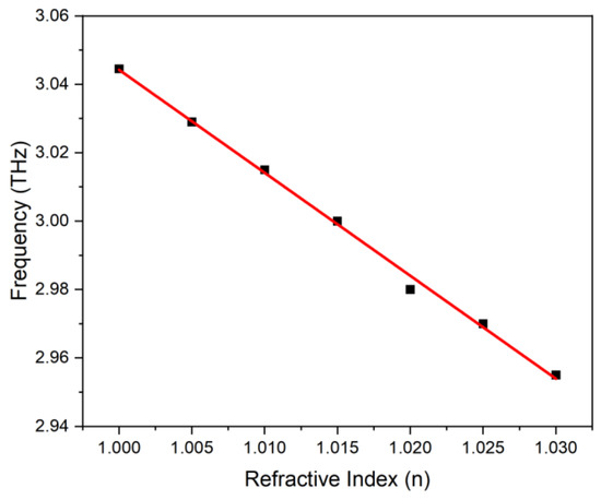 | Ref. [40] | 1 to 1.08 | 99.3% | 3.62 and 3.814 | 3 and 3.59 THz/RIU | 0.07 and 0.0027 | 1329.63 | Yes | No |