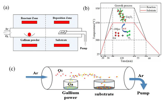 (a) Diagram of the double temperature zone LPCVD system, (b) Diagram of the growth process with time dependent on temperature, (c) Diagram explaining gallium oxide film deposition process.