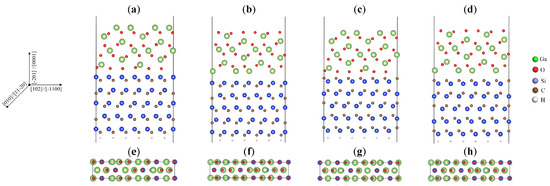 The optimized bulk material parameters of monoclinic gallium oxide are a = 12.49 Å, b = 3.10 Å, c = 5.91 Å and 4H-SiC are a = b = 3.09 Å, c/a = 3.28. Our optimized lattice constants show a good agreement with experimental and theoretical results [14,19,20,21,22]. According to the XRD θ~2θ and off-specular phi-scan results, the (1 × 1) β-Ga2O3(201)–(3×√3) 4H-SiC(0001) interface models were established to simulate the interface between β-Ga2O3 and 4H-SiC. The lattice misfit along the b direction is 0.3% with 1bβ-Ga2O3(010) matching to 1b4H-SiC(1120), while along a direction, the mismatch is about 6.9%, with 3a4H-SiC(1100) matching to 1aβ-Ga2O3(102). The different terminated atoms of (0001)4H-SiC and (201)β-Ga2O3 means that there are four kinds of interface models: Si-O terminated, Si-Ga terminated, C-O terminated and C-Ga terminated. The side view and top view of β-Ga2O3(201)/4H-SiC(0001) models are illustrated in Figure 2a–h. The lattice constant of β-Ga2O3(201)/4H-SiC(0001) interface are: a = 15.56 Å, b = 3.09 Å, c = 36.55 Å, α = β = γ = 90°. The interface models adopted a 5-layer slab of 4H-SiC and 6-layer slab of β-Ga2O3(201).
