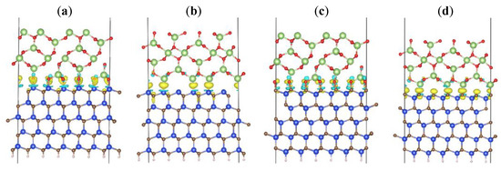 It is well known that high stability and strength can be bound up to the chemical bond type at the interfaces. To understand the electron transfer at the four interfaces, the difference charge density of the β-Ga2O3/4H-SiC heterointerfaces were calculated (see Figure 3). The difference charge density along the z direction Δρ (z) [27,28] is as follows: