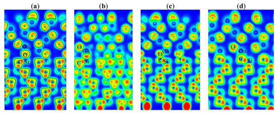 Difference charge density: (a) Si-O, (b) Si-Ga, (c) C-O and (d) C-Ga.