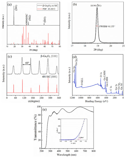 where θ is the Bragg’s angle, λ corresponds to the X-ray wavelength (λ = 0.15406 nm) and k = 0.89. The calculated average grain size D is 51.4 nm. Crystallinity is increased and crystal quality is improved with a smaller FWHM. Figure 5c shows the off-specular phi-scan of β-Ga2O3(111) and 4H-SiC(101) planes. For β-Ga2O3(111) plane, the Bragg angle θ and rotation angle χ are 17.59° and 80.53°, respectively. It is well known that the (111) plane of β-Ga2O3 single crystal has twofold symmetry along the normal direction of <010>. As shown in Figure 5c, there are six diffraction peaks separated by 60° of β-Ga2O3, indicating that a tripartite domain structure exists inside the β-Ga2O3 film [32,33]. The Bragg angle θ and rotation angle χ of 4H-SiC are17.39° and 75.14°, respectively. Due to the 4H-SiC is six-fold symmetry along [0001] direction, there is a diffraction peak every 60° in the diffraction pattern. In comparing the off-specular phi-scan of β-Ga2O3(111) to 4H-SiC (101) planes, it is found that the six φ angles are identical in Figure 5c. Therefore, the 4H-SiC (0001) plane is parallel to (201) plane of the monoclinic gallium oxide (β-Ga2O3(201)||4H-SiC(0001)). Thus, high-quality (201) β-Ga2O 3 film was successfully deposited on the (0001) 4H-SiC substrate. The chemical composition states of β-Ga2O3 thin films were studied by XPS measurement. Figure 5d displays a survey scan of the as-deposited β-Ga2O3 thin films, including photoelectron lines Ga 2p, Ga 3s, Ga 3d, Ga 3p, O 1s and C 1s, respectively [34]. No peak of Si belonging to 4H-SiC substrate was observed as the epitaxial Ga2O3 was thick enough. It is worth noting that the element energy shifts of the C, O and Ga peaks were calibrated by C1s peak at 284.8 eV, which was considered to have originated from the absorption of hydrocarbons or CO2 on the surface. Figure 5e shows the optical transmittance spectrum of the β-Ga2O3/4H-SiC heterojunction in the test coverage of 200 to 800 nm. It is possible to calculate the optical band gap of materials by measuring their transmittance. The smaller band gap of 4H-SiC than β-Ga2O3 means that light sources less than 300 nm cannot pass through the substrate and are all absorbed. Thus, we grow gallium oxide thin films on quartz to measure their optical band gap. Transmittance of β-Ga2O3 film is more than 90% and has weak absorption for wavelengths over 300 nm. In addition, the β-Ga2O3 thin films have high absorptivity in the deep ultraviolet region (200–300 nm) with an absorption edge located at around 270 nm. As can be seen in the inset of Figure 5e, the optical band gap (4.88 eV) is estimated by using the Tauc plot [35], which almost consistent with the values of 4.86 eV [14].