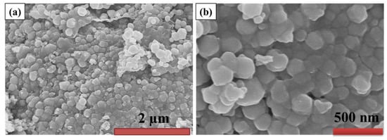 In some cases, the morphological properties of the sensing material can affect the sensing behavior of the developed sensor. In this regard, it is necessary to study the surface structural property of the sol-gel synthesized MoSe2. The top view surface morphological images of the sol-gel synthesized MoSe2 have been presented in Figure 2. The SEM results of the sol-gel synthesized MoSe2 indicated that MoSe2 has uniform morphological characteristics (Figure 2a,b).