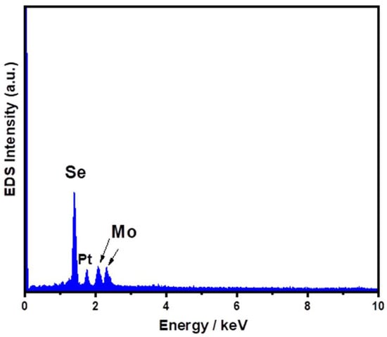 Therefore, we have recorded the EDS spectrum of the sol-gel synthesized MoSe2. The obtained EDS spectrum of the sol-gel synthesized MoSe2 is shown in Figure 3. The obtained EDS results suggested the presence of peaks related to Mo and Se elements only. No peak for any other element appeared in the EDS spectrum of the sol-gel synthesized MoSe2, which indicated the good phase purity of the sol-gel synthesized MoSe2.
