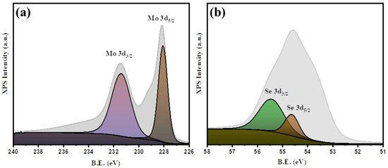 The XPS method is a more useful technique to study the presence of oxidation states or elemental compositions of the prepared materials. Hence, the XPS technique was also applied to ascertain the oxidation states of the Mo and Se elements in the sol-gel synthesized MoSe2. The obtained XPS results for the sol-gel-prepared MoSe2 are shown in Figure 4a,b.