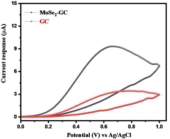 Initially, we investigated the electrochemical sensing behavior of the GC in 350 µM hydrazine using cyclic voltammetry (CV). The CV of the GC was obtained in 350 µM hydrazine under applied potential at a scan rate of 50 mVs−1 (Figure 5). The 350 µM hydrazine was prepared in 0.1 M PBS of pH 7.0, which was used for all electrochemical investigations. The obtained CV data of the GC revealed a very low current response of 3.47 µA for the electro-oxidation of hydrazine (Figure 5). Further, the electrochemical sensing ability of the MoSe2-GC was examined under similar conditions and environment. The CV result for MoSe2-GC is provided in Figure 5. The CV results show the enhanced current of 9.48 µA for MoSe2-GC towards the electro-oxidation of 350 µM hydrazine under an applied potential scan rate of 50 mVs−1. The presence of MoSe2 on the bare GC surface acted as an electro-catalytic agent and improved the electro-oxidation of hydrazine.