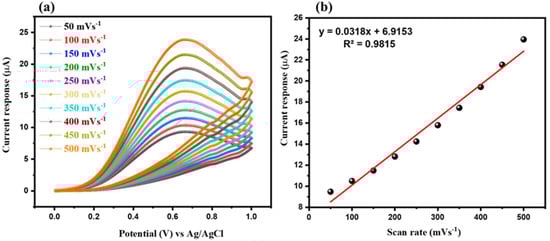 The applied potential scan rate was also varied to examine the effect of the scan rate on the electro-oxidation of 350 µM hydrazine using MoSe2-GC. The scan rate was varied in the range of 50 mVs−1 to 500 mVs−1. The obtained CV results for the electro-oxidation of 350 µM hydrazine using MoSe2-GC at scan rates of 50–500 mVs−1 are displayed in Figure 6a. The obtained CV trend shows that the current for the electro-oxidation of hydrazine increases when the scan rate changes from 50 mVs−1 to 500 mVs−1. This increment in the current for the electro-oxidation of hydrazine was found to be linear as shown in the calibration plot between the electro-oxidation peak current and applied scan rate (Figure 6b).
