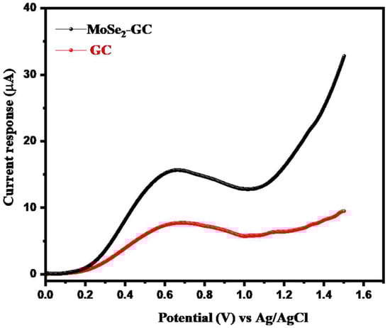 Further, we explored linear sweep voltammetry (LSV) as an electrochemical sensing technique towards the sensing of hydrazine. The LSV of the GC was obtained in 350 µM hydrazine at a scan rate of 50 mVs−1 (Figure 7). The collected LSV data of the GC revealed the current response of 8.14 µA for the electro-oxidation of hydrazine (Figure 7). Subsequently, electrochemical sensing behavior of the MoSe2-GC was also examined under similar conditions (350 µM hydrazine; scan rate = 50 mVs−1). The collected LSV result for MoSe2-GC is presented in Figure 7. The observations indicated that MoSe2-GC has an improved current of 15.86 µA for the electro-oxidation of 350 µM hydrazine under an applied scan rate of 50 mVs−1 (Figure 7). Therefore, the MoSe2-GC has good electro-catalytic behavior towards the determination of hydrazine. Hence, our research group selected this MoSe2-GC for further hydrazine sensing examinations.