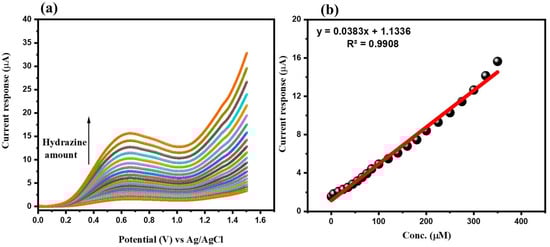 The LSV response of the MoSe2-GC was recorded in the presence of various concentrations (0.05 µM to 350 µM) of hydrazine. The recorded LSV responses of the MoSe2-GC in various concentrations (0.05 µM to 350 µM) of hydrazine are shown in Figure 8a. The observations revealed that the current for the electro-oxidation of hydrazine increased with respect to the concentration of hydrazine. The electro-catalytic current response was found to be directly proportional to the concentration of hydrazine. The current for the electro-oxidation of hydrazine increased linearly with respect to the concentration of hydrazine, as shown in the calibration curve between the current versus the concentration of hydrazine (Figure 8b).