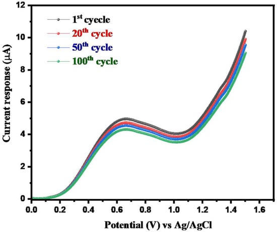 Cyclic stability and repeatability are the most important parameters for the practical use of any sensor. Therefore, we have also studied the cyclic repeatability and stability of the MoSe2-GC for hydrazine sensing. The LSV curves of the MoSe2-GC were obtained in 100 µM hydrazine under an applied potential scan rate of 50 mVs−1. The 1st, 20th, 50th, and 100th LSV curve of the MoSe2-GC in 100 µM hydrazine are displayed in Figure 9. These studies showed that MoSe2-GC retained good cyclic stability or cyclic repeatability in the 100th cycles.