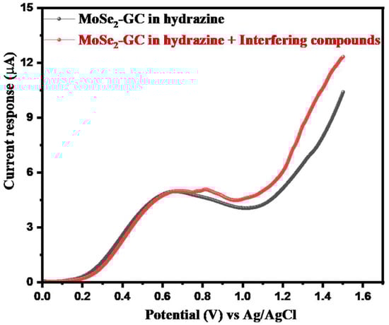 The electrochemical sensors should possess a high anti-interference nature. In this regard, our research group investigated the anti-interference nature of the MoSe2-GC using LSV. The LSV curves of the MoSe2-GC were obtained in 100 µM hydrazine and 100 µM hydrazine + 500 µM interfering compounds (phenol, catechol, urea, ascorbic acid, glucose, dopamine, hydrogen peroxide, NaCl, and uric acid). The obtained LSV curves are displayed in Figure 10. According to Figure 10, the presence of various interfering compounds could not affect the current response of the MoSe2-GC for hydrazine determination. Thus, it can be easily said that MoSe2-GC has a good anti-interference nature. We have also obtained the Raman spectrum of MoSe2 after electrochemical investigations (Figure S1). There was no significant change observed.