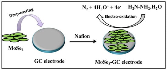 A glassy carbon (GC) electrode with a 3 mm diameter was cleaned with 0.5 µm alumina slurry and velvet pad. Further, 2 mg MoSe2 was dispersed in 1 mL of ethanol (5 µL nafion) and sonicated for 1 h. Nafion acted as a binder to enhance the adhesiveness of the MoSe2 film on the GC surface. Later, 8 µL of the prepared MoSe2 dispersion was carefully drop-casted on the GC surface (Scheme 1). The film thickness of MoSe2 was ~2.0 µm.