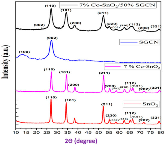 XRD pattern of SnO2, 7%Co-SnO2, SGCN, and 7%Co-SnO2/50% SGCN.