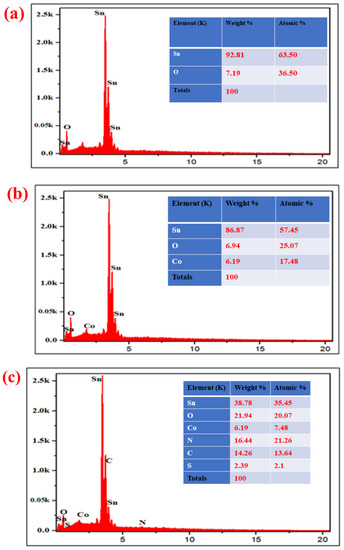 EDX spectrum of SnO2, Co-SnO2, and Co-SnO2 composite with SGCN are shown in Figure 2a–c. The spectrum of SnO2 (Figure 2a) and Co-SnO2 (Figure 2b) revealed the existence of tin (Sn), oxygen (O), and cobalt (Co) elements with slightly higher atomic and weight percentages of tin. Similarly, the EDX spectrum of Co-SnO2 composite with SGCN (Figure 2c), shows the existence of carbon ©, cobalt (Co), nitrogen (N), oxygen (O), sulfur (S), and tin (Sn) elements. The percentage composition of these components is also given along with the elemental spectrum. Detected elements in the EDX spectrum, confirm the successful synthesis of the Co-SnO2/SGCN composite.