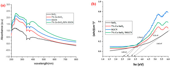 Absorption spectra (a) and bandgap of SnO2, 7% Co-SnO2, and 7% Co-SnO2/50% SGCN (b).