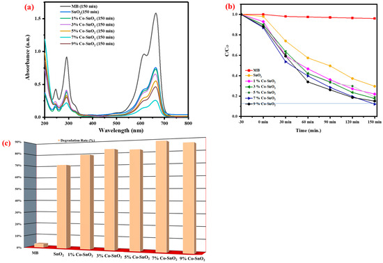 Figure 6b shows the photocatalytic efficiency of SnO2 and (1, 3, 5, 7, and 9 wt.%) Co-SnO2 NPs against MB. From Figure 6a,b, it can be seen that 7% Co-SnO2 NPs showed the maximum degradation of MB (83% in 150 min) as compared to other fabricated samples. From Figure 6b, the plots of C/Co versus time for the degradation of MB in the presence of photocatalysts show that the pure SnO2 degraded less dye than the nanoparticles of Co-SnO2. The reason for the highest degradation by 7% Co-SnO2 is that Co ions and oxygen states that act as electron and hole pair trapping centers introduce defect levels between the conduction and valance bands. These trapping centers reduce the recombination of electron-hole pairs and increase photocatalytic activity. However, photocatalytic activity was increased at the optimal level of cobalt doping (7%); after that, the photocatalytic activity began to decrease. When there is a high level of doping, it provides recombination centers for electron-hole pair recombination and decreases photocatalytic activity [58,62,63]. The bar graph in Figure 6c shows the final % degradation of MB dye by various Co-SnO2 NPs after 150 min.