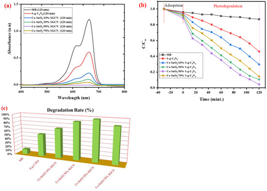 Figure 7c presents the bar graph of the % degradation of MB by NCs. It is evident from the graph that the lowest degradation rate is shown by the methylene blue solution, which is kept without a photocatalyst. The methylene blue degradation rate with 7% Co-SnO2/50% SGCN nanocomposite is faster than all other composites, as shown in Figure 8b,c. A further increase in SGCN concentrations > 50% decreases the catalytic efficiency and suppresses MB’s degradation. It means that the optimum concentration of SGCN to enhance photocatalytic activity is 50%. The photocatalytic effectiveness of the 7% Co-SnO2/50% SGCN NC is higher than that of the previously reported composites because Co-SnO2 and SGCN successfully formed good heterojunctions [60,61,62,63,64,65,66,67,68]. The transport and separation of e− and h+ in the composite may also be facilitated by cobalt atoms.