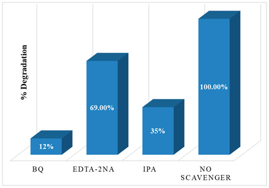 Superoxide radicals(·O2−), hydroxyl radicals(·OH), and photogenerated holes (h+) are often the main active species for the degradation of organic contaminants in water. The importance of active species (·OH, h+, and ·O2−) in the photocatalytic reaction was investigated in order to explore the photodegradation mechanism of MB by the Co-SnO2/50% SGCN catalyst (Figure 8). Particularly, benzoquinone (BQ) was used to trap ·O2−, isopropanol (IPA) was used to trap ·OH, and EDTA-2Na was used to capture holes (h+). The efficiency of MB deterioration was reduced by 88% after adding benzoquinone. However, the degradation rates of MB were only significantly reduced by 65% and 31%, respectively, by IPA and EDTA-2Na. The scavenging effect of the free radicals is given by the bar graph as shown in Figure 8. The results showed that, instead of holes (h+), the ·OH and ·O2− are the major reactive species involved in photocatalytic dye degradation.