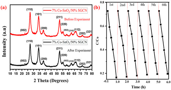 The stability and recyclability of the photocatalyst (a). X-ray diffraction patterns of the Co-SnO2/50% SGCN NCs before the experiment and after the 6th cycle (b).