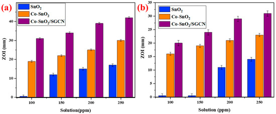 It has been observed from the photocatalytic activity that all the prepared samples act as photocatalysts under sunlight irradiation, which degrades the dye, i.e., methylene blue, by the formation of reactive oxygen species (ROS). The amount of ROS formed is light-dependent; as the production of ROS increases under the sun, the antibacterial activity of nanoparticles and nanocomposites also increases significantly [70,71]. Another factor that affects the antimicrobial activity of tin oxide and its composites is the energy band gap. The lower band energy and the higher surface area provide good antibacterial results. By evaluating the results and comparing zones of inhibition, it was found that tin oxide showed no antibacterial activity at 100 ppm concentration, while at higher concentrations it showed activity against both gram-positive and gram-negative bacteria. At all concentrations, the nanocomposite demonstrated good antibacterial activity against gram-negative (E. coli) (Figure 10a) and gram-positive (B. subtiles) (Figure 10b) bacterial strains. The lowest antibacterial activity was shown by tin oxide, cobalt-doped tin oxide also showed good results.