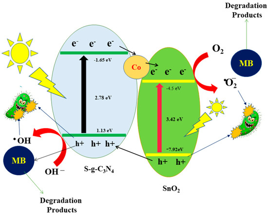 As anticipated by a schematic diagram, the creation of e−/h+ pairs in the photocatalysts may be responsible for the rapid degradation of methylene blue and the antibacterial action of photocatalysts (Figure 11). When Co-SnO2/S-g-C3N4 is exposed to solar radiation, both Co-SnO2 and S-g-C3N4 are energized and e−/h+ pairs are photogenerated on their conduction band (CB) and valence band (VB), respectively [71,72]. Since the conduction band (CB) of Co-SnO2 had a lower potential than the CB of S-g-C3N4 (−1.12 eV) based on the energy level of CB/VB, the photo-induced electrons moved between the two bands with ease. Additionally, Co-SnO2 may absorb the holes that were made in the VB of S-g-C3N4 [61]. The presence of Co atoms in the hybrid composite not only reduced the value of Eg but also facilitated the transfer of electrons from S-g-C3N4 to Co-SnO2. Therefore, doping might considerably reduce the likelihood of charge recombination by raising the separation of photoexcited e/h+ pairs. Reactive oxygen species (ROS) are created when the photogenerated e/h+ interact with oxygen and water molecules that are on the photocatalyst’s surface. The produced radicals then degrade MB and kill bacteria in an oxidative manner to degrade MB [72].