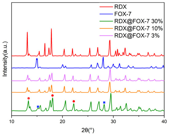 XRD patterns of the RDX, FOX-7, and RDX@FOX-7 composite.