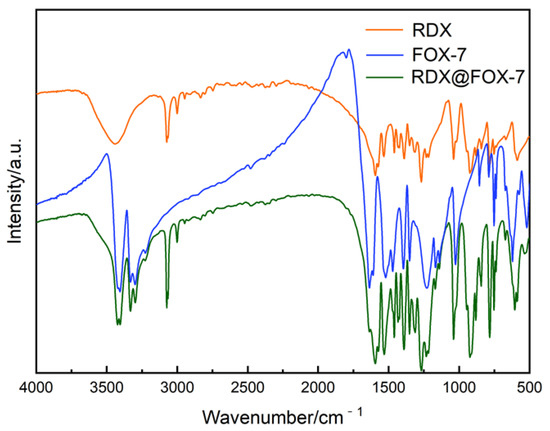 FT-IR spectra of the RDX, FOX-7, and RDX@FOX-7 composite with mass ratios of 10%.