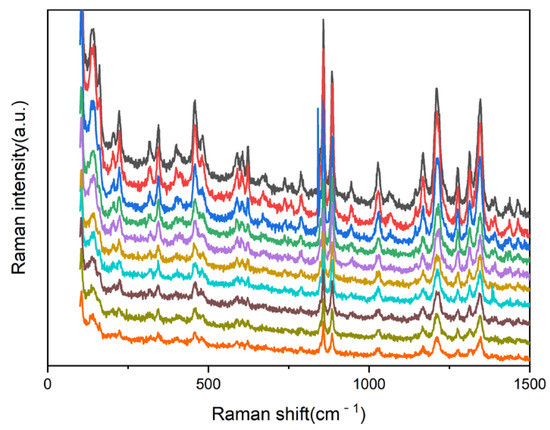 Most composites have problems with uneven distribution These unevenly distributed composites are easy to be separated in use and cannot guarantee stable performance, which has a great impact on the reliability and service life of products. Raman spectroscopy can be used to identify the components distribution of composite by observing the characteristic peak of Raman characteristic peak. The crystal quality of RDX@FOX-7 was characterized by micro-Raman spectra at 10 different points, and the results are shown in Figure 5. It can be seen that the peak shape in the Raman spectra of each point has a good consistency. Seven important Raman peaks were observed. The characteristic peaks at 476 cm−1, 1340 cm−1, and 1548 cm−1 belong to the symmetric rocking vibration peak corresponding to N-H, the symmetric stretching vibration peak corresponding to C-NO2, and the torsional vibration peak corresponding to NH2 in FOX-7. Similarly, the characteristic peaks at 467 cm−1, 923 cm−1, 1274 cm−1, 1311 cm−1, 1388 cm−1, and 1377 cm−1 belong to the tensile vibration of N-N, the rocking vibration of CH2, the tensile vibration of N-NO2 and the bending vibration outside the C-H plane in RDX, indicating that a type of composite explosive with excellent uniformity was achieved.