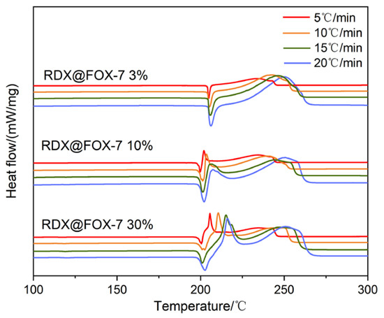 DSC curves of RDX@FOX-7 composite with different mass ratios at different heating rates.