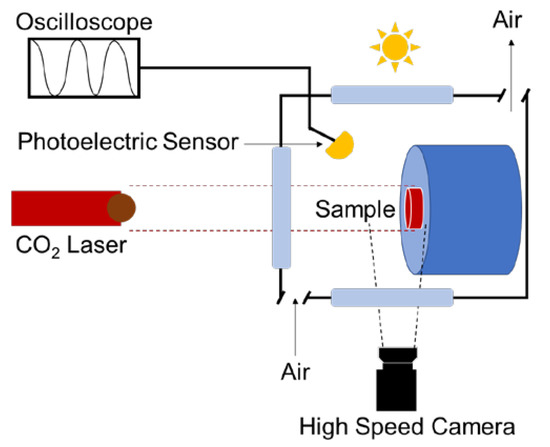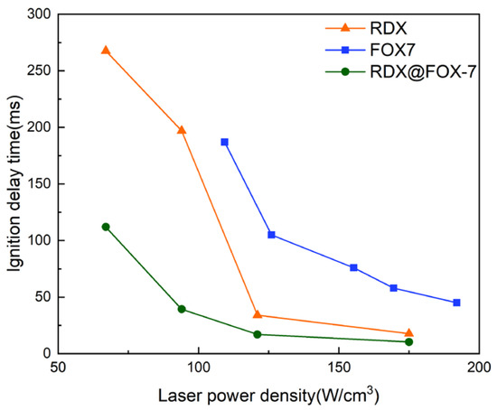 Ignition is the beginning of combustion process, followed by pyrolysis reaction. Studying the ignition characteristics of RDX@FOX-7 can provide information support for its further application in the solid propellants. The ignition and combustion process of all samples were studied by using a laser ignition apparatus, which is shown in Figure 8. The radiation wavelength of the laser is 10.6 μm and the irradiation time is 5 ms. The time between the laser emission and the appearance of the flame is defined as the ignition delay time. The kinetics and mechanism of thermal decomposition affect the ignition delay time and flame structure, respectively. The change of ignition delay time with laser power density is shown in Figure 9. With the increase of laser power density, the ignition delay time first decreases rapidly and then tends to be constant. RDX@FOX-7 has a lower latency compared to RDX and FOX-7. This can be explained in relation to the results of thermal decomposition. The first thermal decomposition of the FOX-7 interacted with RDX, bringing the overall advance.
