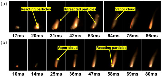 Sequential images for the combustion initial process of samples at the laser power density of 175 W/cm2: (a) RDX, (b) RDX@FOX-7 composite.
