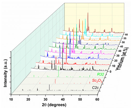 In a first approximation, based on the fact that the difference between the ionic radii of La3+ and Y3+ ions is smaller than that of Y3+ and Sc3+ ions in six-fold coordination (rLa-rY = 0.132 Å and rY-rSc = 0.155 Å) [14], in order to determine the minimum doping concentration with Y cations in the LSB structure that leads to the trigonal phase formation as the majority phase, we assumed that Y3+ ions replaced only La3+ cations in the LSB structure. This meant that, in this approximation, the general formula of LYSB was presumed to be La1-xYxSc3(BO3)4. Therefore, different La1-xYxSc3(BO3)4 compounds with 0 ≤ x ≤ 0.6 were synthesized by the solid-state reaction method. Oxide powders of 5N purity (La2O3, Y2O3, and Sc2O3) and 99.98% B2O3 were used as starting materials. Considering the evaporation of B2O3 during the synthesis of polycrystalline compounds, to the stoichiometric amounts was added an excess of B2O3 (5 wt. %). Before weighing, the oxide powders of Sc2O3, Y2O3, and La2O3 were heated for 12 h at 1000 °C in air to eliminate absorbed water. Then, the powders were mixed, pressed into tablets, and sintered in atmospheric air for 24 h at 1300 °C. The X-ray powder diffraction (XRPD) spectra were measured at room temperature in the 2θ range of 10°–60° using a PANalytical Empyrean X-ray diffractometer (λ = 1.5406 Å). XRPD spectra of the polycrystalline compounds La1-xYxSc3(BO3)4 having x from 0 at. % to 60 at. % are presented in Figure 1. As can be seen, the phase transition from the monoclinic structure of LSB (space group C2/c) to the trigonal structure of LYSB (space group R32) was achieved for a Y concentration over 40 at. %. However, there were still some diffraction peaks that were not indexed by the trigonal structure. Therefore, the Rietveld method was employed to quantify each phase of the compounds with x > 40 at. %. As expected, the analysis revealed the existence of one dominant trigonal phase (space group R32) in a proportion larger than 93 wt. % and two minority phases, the monoclinic phase (space C2/c) and the cubic phase of Sc2O3, which were quantified to be smaller than 2 wt. % and 5 wt. %, respectively, in all synthesized compounds.