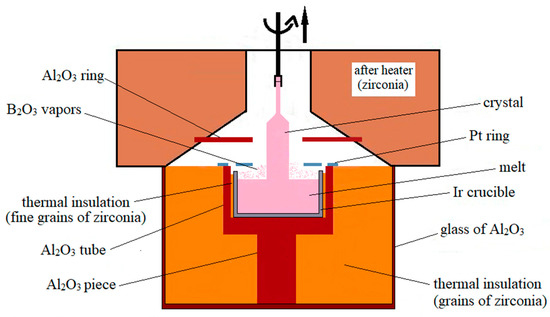 Thermal setup developed for growing LYSB-type crystals by the Czochralski crystal growth technique. (Reprinted with permission from ref. [13], copyright 2019 American Chemical Society).