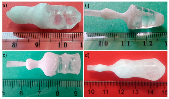 An ADL-MP crystal growth furnace equipped with a TruHeat MF 5030 induction heating generator (100 kHz) was used to grow LYSB-type crystals by the Czochralski technique. The growth experiments were performed using iridium (Ir) crucibles with a height of 30 mm and a diameter of 30 mm in a static atmosphere of N2 gas with 5N purity. In these conditions, five LYSB-type crystals were grown from melts with the initial compositions La0.754Y0.546Sc2.70(BO3)4, La0.7875Y0.4625Sc2.75(BO3)4, La0.8625Y0.4375Sc2.70(BO3)4, La0.8125Y0.4375Sc2.75(BO3)4, and La0.765Y0.485Sc2.75(BO3)4. Figure 4 shows the first four as-grown crystals. They were grown along the ⟨0 0 1⟩ direction using LGSB-oriented seeds and were of moderate quality, having a regular hexagonal shape typical of huntite-type crystals grown along the crystallographic c-axis [12]. As can be seen from Figure 4b, the crystal grown from the melt with initial composition La0.7875Y0.4625Sc2.75(BO3)4 had a large transparent region inside the crystal body, which was very promising for cutting and obtaining crystal samples. During the growth of this crystal, the pulling rate used was 1.8 mm/h, and the rotation rate of the seed was kept constant at 10 rpm. However, when the crystal was tested for SHG of the fundamental wavelength 1064 nm, diffuse green radiation scattered in different directions was observed, thus indicating the existence of twinning defects, similar to the case of LYSB and YAB crystals grown by the flux method [15].