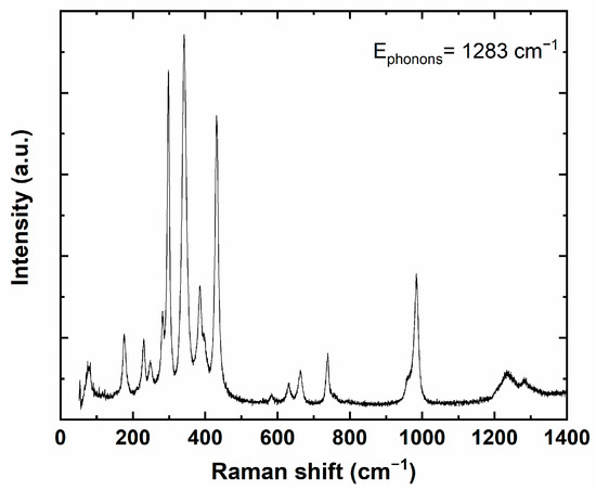 The Raman spectrum of the LYSB crystal was also registered at room temperature under the laser excitation wavelength of λ = 633 nm on the same 1.75 mm thick oriented crystal sample. The obtained spectrum is shown in Figure 11. The maximum phonon energy was found to be ~1283 cm−1, lower than the values determined for the YAB (>1400 cm−1) and Czochralski-grown Pr:LGSB (~1414 cm−1) crystals [17,18].