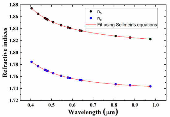 where i denotes the ordinary (o) or extraordinary (e) indices; λ is the wavelength expressed in µm; and A, B, C, and D are the Sellmeier coefficients (listed in Table 4). Figure 13 shows the dispersion curves of the refractive indices along with the fit of the experimental data.