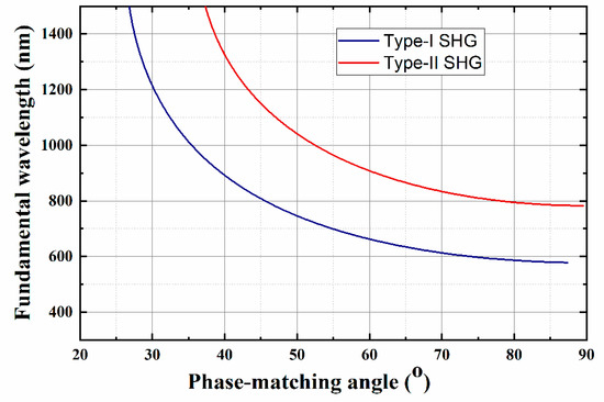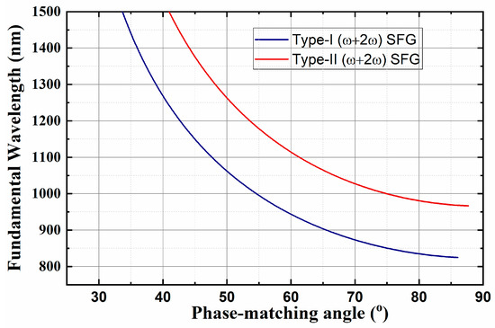 Phase-matching curves for SFG of types I and II in the LYSB crystal. (Reprinted with permission from ref. [13], copyright 2019 American Chemical Society).